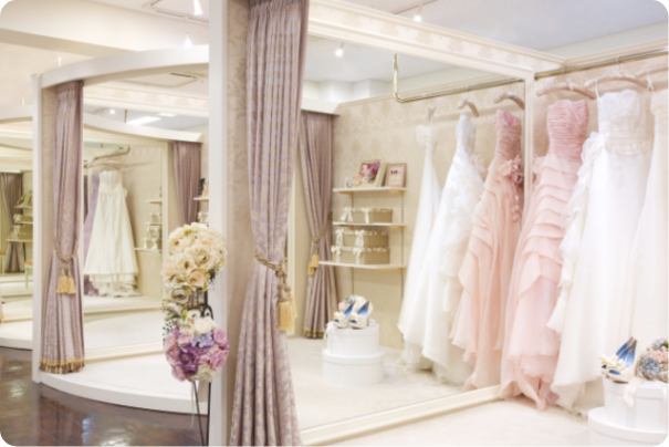 ウェディングドレスやタキシード、和装、列席者用衣装まで、多彩なラインナップを取り揃えています。 専任スタイリストが丁寧にカウンセリングを行い、お客様の想いやテーマに寄り添った一着をご提案。 人生最良の日を彩る、運命の衣装選びをサポートします。
