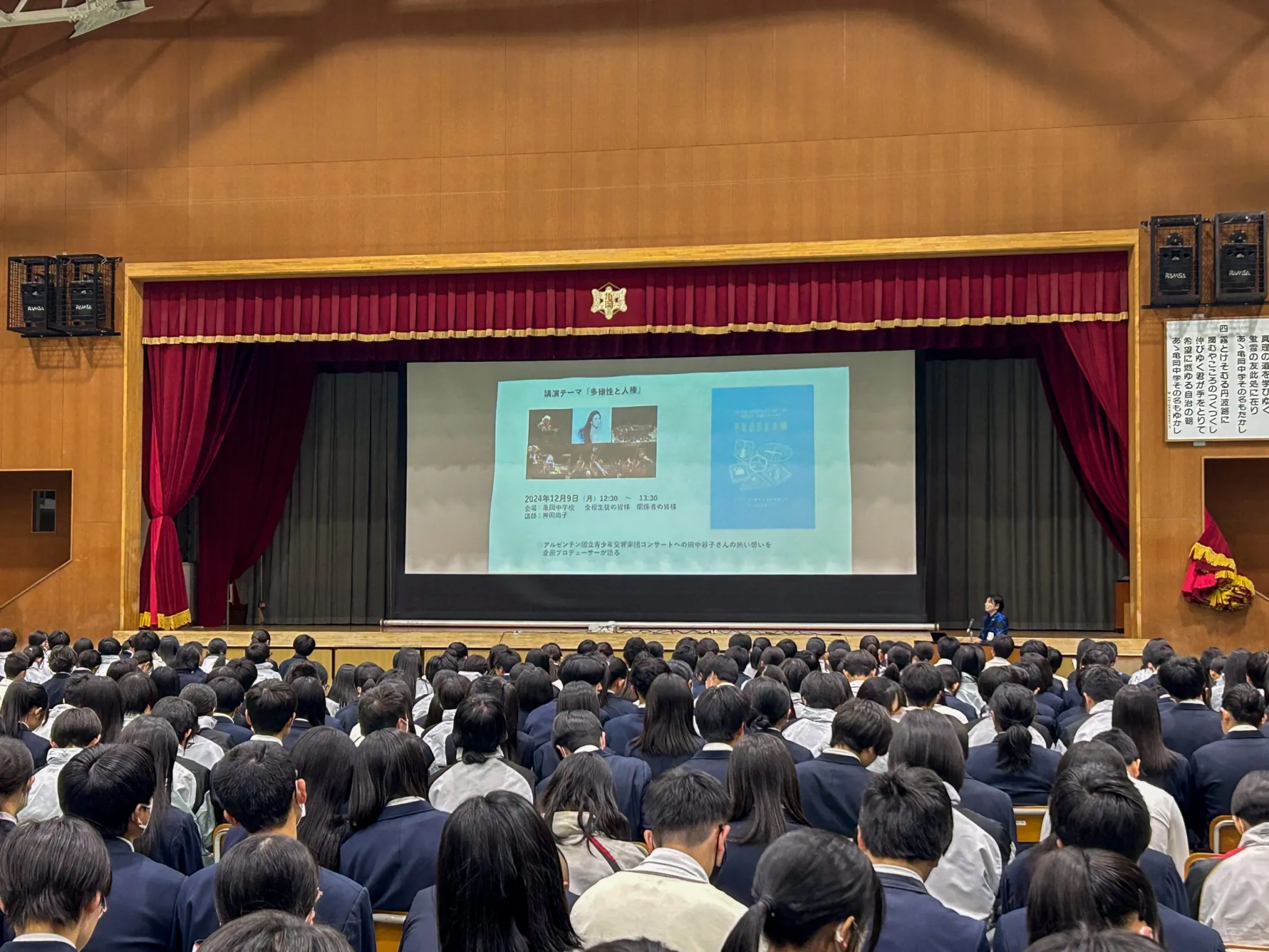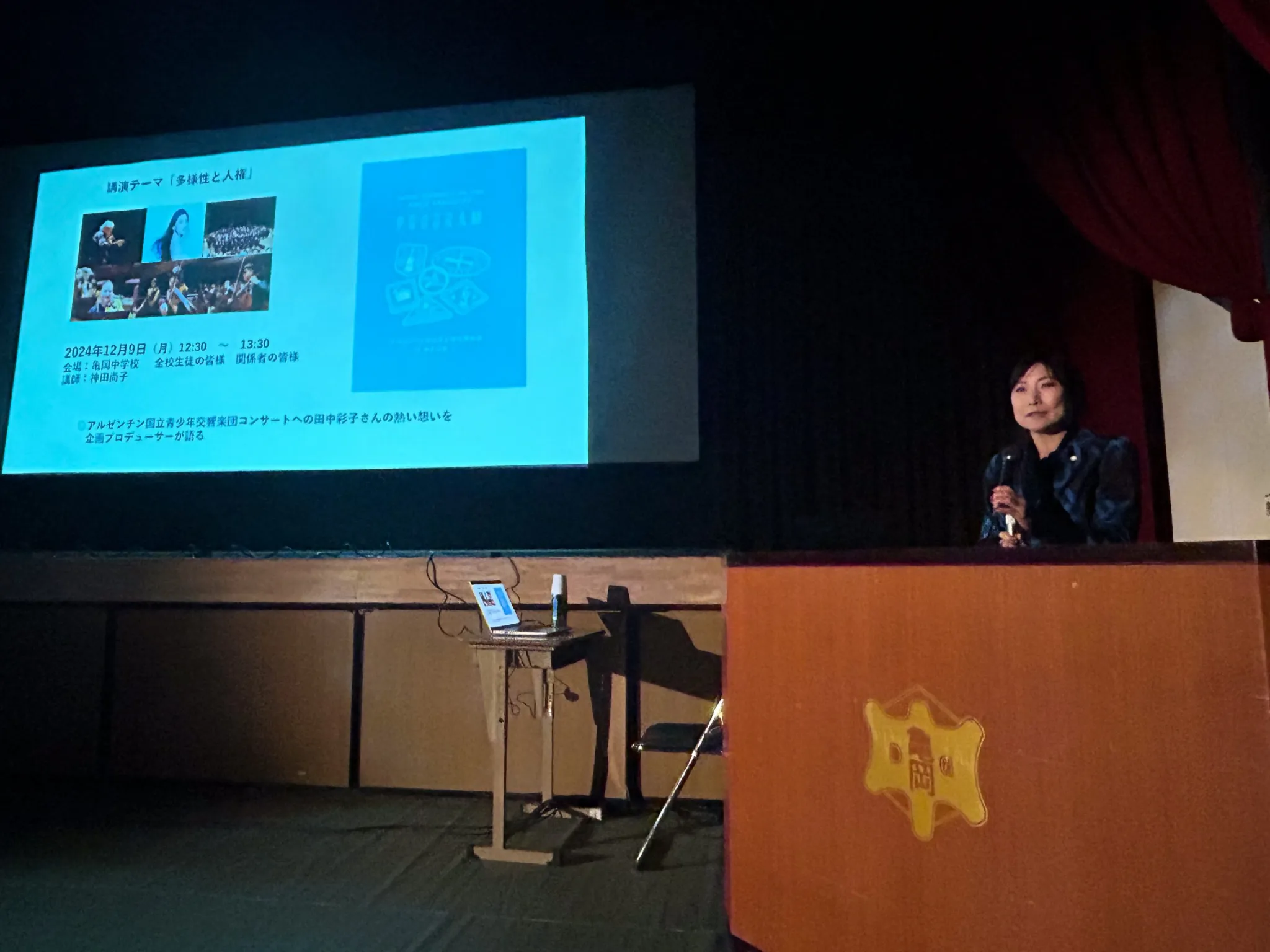 また田中彩子さんから学生の皆様に向けてのメッセージ動画や、京都府人権啓発イメージソング「世界がひとつの家族のように」を楽団が演奏している動画などもご覧いただきました。